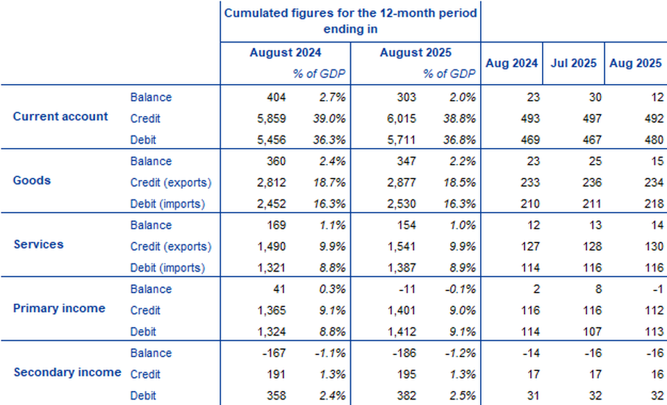 In the 12 months to August 2025, the current account recorded a surplus of €303 billion (2.0% of euro area GDP), compared with a surplus of €404 billion (2.7% of euro area GDP) one year earlier. This decrease was explained by a deterioration of all the accounts, particularly by a switch from a surplus (€41 billion) to a deficit (€11 billion) for primary income, but also by a larger deficit for secondary income (up from €167 billion to €186 billion), and reductions in the surplus for services (down from €169 billion to €154 billion) and goods (down from €360 billion to €347 billion).