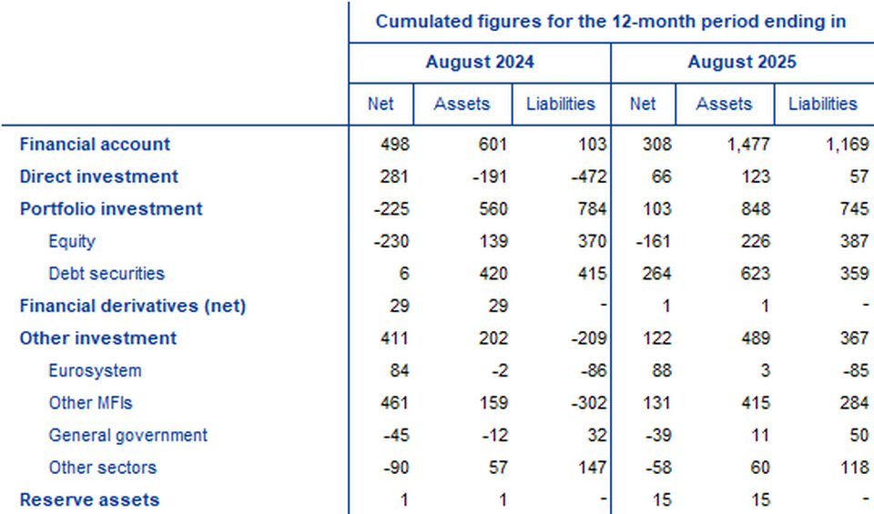 - In financial account, euro area residents’ net acquisitions of non-euro area portfolio investment securities totalled €848 billion and non-residents’ net acquisitions of euro area portfolio investment securities totalled €745 billion in the 12 months to August 2025