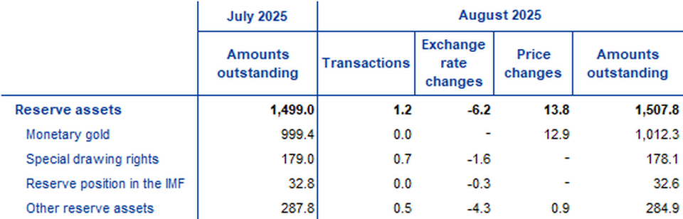 In August 2025 the Eurosystem’s stock of reserve assets increased to €1,507.8 billion up from €1,499 billion in the previous month (Table 3). This increase was driven by positive price changes (€13.8 billion), mostly due to an increase in the price of gold, and, to a lesser extent, by net acquisitions of assets (€1.2 billion) which were partly offset by negative exchange rate changes (€6.2 billion).