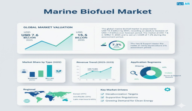 ROCKVILLE, MD, UNITED STATES, October 24, 2025 /EINPresswire.com/ -- The global marine biofuel market is projected to grow from USD 7.6 billion in 2025 to USD 15.5 billion by 2035, registering a CAGR of 7.3% and an absolute increase of USD 7.9 billion.The market is expected to nearly double over the forecast period, driven by rising adoption of alternative fuels in maritime shipping, increasing demand for advanced biofuel technologies, and growing investments in decarbonization initiatives and low-carbon fuel infrastructure. Challenges include high production costs and limited supply chain capacity for advanced biofuels.