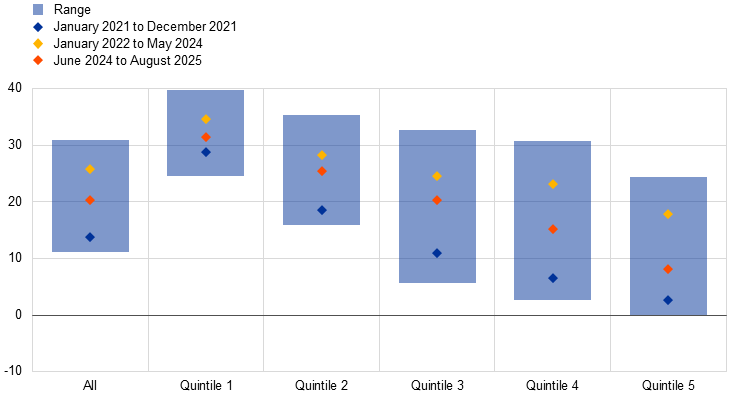 Notes: Population-weighted data. The chart plots the differences between the percentages of respondents who reported that credit access had become tighter over the past 12 months and the percentages of those who reported that it had eased. Statistics are reported by quintiles of income distribution. The diamonds represent averages over the relevant period. January 2022 to May 2024 was classified as the tightening period, since long-term interest rates started to increase in early 2022 in anticipation of the imminent interest rate hikes and because the first interest rate cut was not implemented until June 2024. The latest observation is for August 2025.