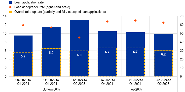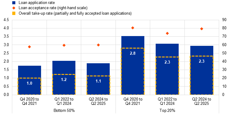 Notes: Population-weighted data. The blue bars indicate the average share of consumers who applied for a specific type of loan over the period shown on the x-axis. The red diamonds represent the share of loan applications that were either fully or partially accepted. The yellow dashed lines and numbers are a proxy for the overall loan take-up rate, calculated by multiplying the application rate by the acceptance rate. Figures after April 2022 include the five additional countries that were added to the ECB Consumer Expectations Survey sample at that time. Consumer loans include applications for car loans, leasing contracts, credit cards and bank accounts with an overdraft facility. The latest observation is for July 2025.