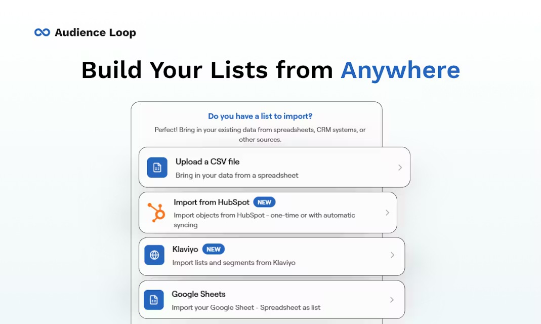 Audience Loop sits on top of the tools marketers already use spreadsheets and CRMs, turning static lists into live, decision-grade audiences: