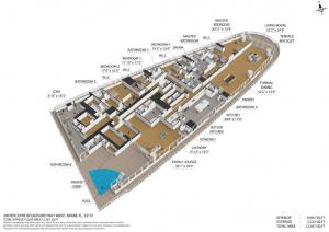 In addition to its gallery-oriented spaces, the residence includes a Bradford pool on the terrace, indoor/outdoor entertaining areas, a private gym, and staff quarters. Residents also have direct access to more than 42,000 square feet of shared amenities at Aston Martin Residences, including a spa, fitness center, superyacht marina, and sky lounge.