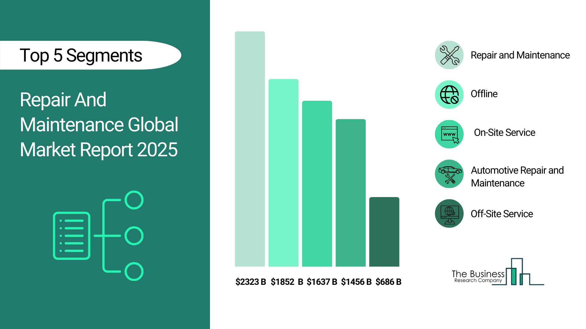 The repair and maintenance market is segmented by service into off‑site service and on‑site service. The on‑site service market will be the largest segment of the repair and maintenance market segmented by service, accounting for 70% or $1,637 billion of the total in 2029. The on‑site service market will be supported by its ability to provide immediate troubleshooting, minimize equipment downtime, offer personalized support, enhance convenience and maintain continuous operations, along with growing adoption among manufacturing plants, corporate offices, fleet operators and residential consumers to meet rising demand for flexible, responsive and time-saving maintenance solutions. For example, in June 2025, Guerrero Mobile Mechanics, a US-based on-site vehicle repair services provider, launched its mobile auto repair services, supported by a new digital platform designed to enhance scheduling, transparency and customer convenience. This expansion aims to make vehicle maintenance and emergency repairs more accessible by eliminating the need for traditional garage visits. Customers can now schedule appointments, receive real-time updates and access mobile diagnostic services through an online portal or mobile application, allowing for upfront pricing and remote tracking of repair progress.