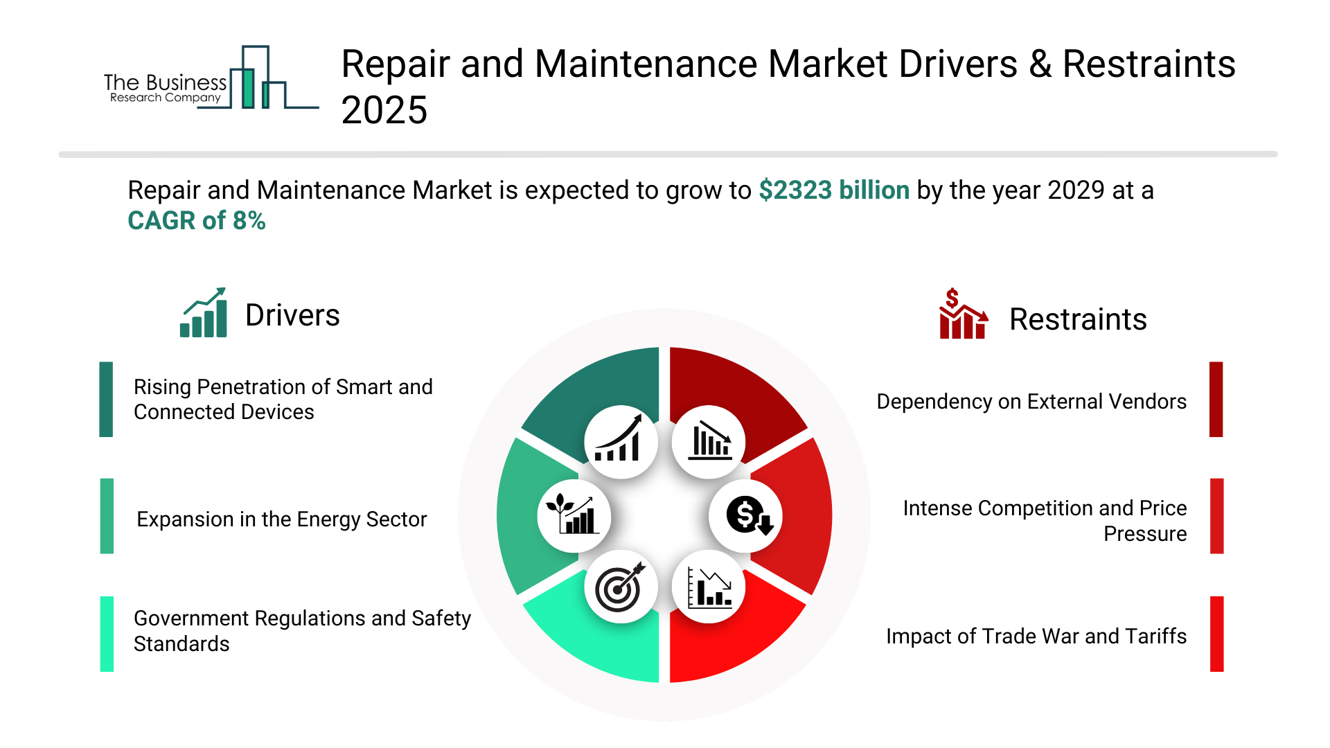 Rising Penetration Of Smart And Connected Devices - The rising penetration of smart and connected devices will become a key driver of growth in the repair and maintenance market by 2029. As both businesses and consumers incorporate more IoT-enabled products and intelligent systems into their operations and everyday routines, the need for specialized maintenance services continues to rise. These advanced devices often require routine diagnostics, software updates, and technical support to maintain optimal functionality and extend their lifespan. Furthermore, the complexity of interconnected systems presents new opportunities for service providers to deliver customized solutions. As a result, the expanding ecosystem of smart technologies is poised to become a major growth driver for the repair and maintenance industry. As a result, the rising penetration of smart and connected devices is anticipated to contributing to a 2.0% annual growth in the market.