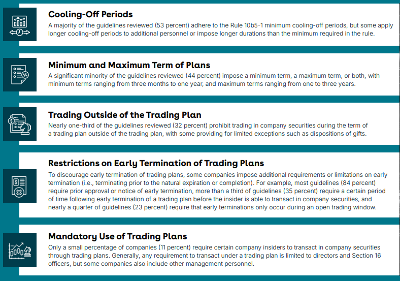 In response to concerns about the rule’s potential for abuse, in 2022, the SEC amended Rule 10b5-1 (the 2022 amendments), introducing new conditions for the affirmative defense under Rule 10b5-1(c). [3] These conditions include a minimum cooling-off period following adoption of the plan, director and officer representations, prohibitions on multiple overlapping plans, limitations on single trade plans, and an expanded good faith requirement. Beyond these enhanced conditions, many companies continue to impose their own additional conditions, such as minimum and maximum terms, limits on trading in company securities outside of the plan, and limits on early termination of the plan, among others. The Rule 10b5-1 conditions as well as the company-imposed conditions are typically documented in written trading plan guidelines.