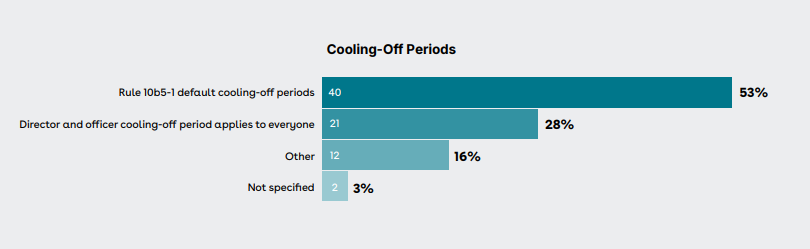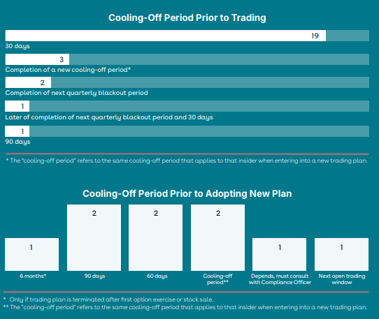 For those guidelines that require a cooling-off period following early termination, 26 guidelines require a cooling-off period prior to any open market trading and nine guidelines require a cooling-off period before the insider may adopt a new trading plan.