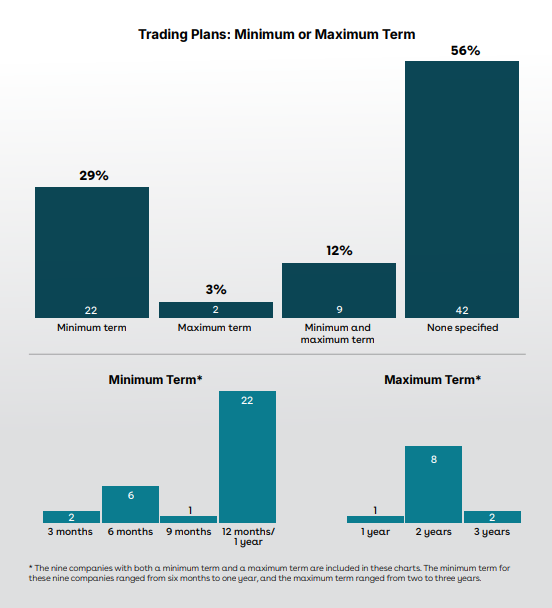 Some guidelines provide for minimum terms, maximum terms, or both, for trading plans. Having limits on the term of a trading plan allows the insider to re-evaluate and change trading instructions periodically in conjunction with adopting a new 10b5-1 plan or to revert to non-plan trading without having to modify their plan or terminate their plan early.