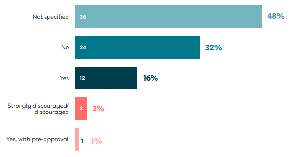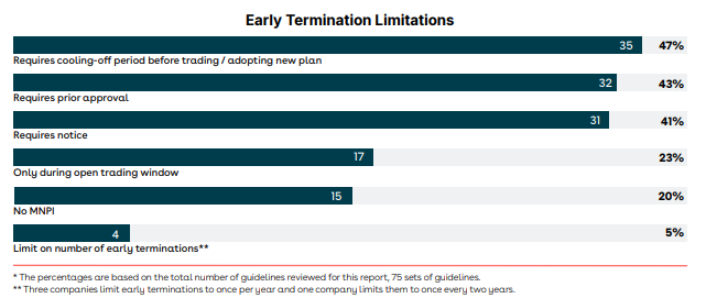 Terminating a trading plan prior to its expiration or completion is generally discouraged absent situations in which market volatility or personal circumstances fundamentally alter the conditions under which the insider adopted the trading plan. While terminations are generally not prohibited, there are a variety of ways that companies attempt to mitigate the potential adverse implication of early terminations. For example, guidelines may require early terminations to occur in an open trading window or when the insider is not aware of MNPI, or require prior approval or notice. In addition, they may limit the frequency of early terminations or require a cooling-off period following termination before the insider may trade in company securities or enter into a new trading plan. The chart below reflects the prevalence of these limitations in the guidelines reviewed. Please note that some guidelines include more than one of these limitations. For example, eight of the guidelines reviewed limit early terminations to open trading windows and at a time when the insider is not aware of MNPI, and only allow early terminations with prior approval.
