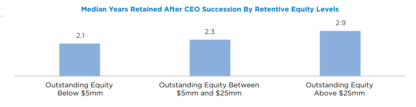 As shown in the table below, a moderate correlation exists between total retentive equity levels and retention periods of non-CEO NEOs following CEO turnover. NEOs with less than $5mm in total retentive equity stayed for a median of 2.1 years, those with retentive equity between $5mm and $25mm stayed for 2.3 years, and those with retentive equity greater than $25mm stayed for 2.9 years. While higher retentive equity levels are indeed correlated with higher retentive power, we note that the difference of 0.8 years between the lowest-value group and the highest-value group is relatively short.