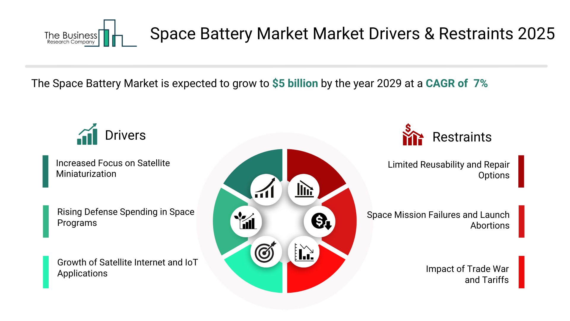 Increased Focus On Satellite Miniaturization - The increased focus on satellite miniaturization will become a key driver of growth in the space battery market by 2029. The increased focus on satellite miniaturization boosts demands for compact, lightweight, and high-energy-density space batteries. Smaller satellites, such as CubeSats and nanosatellites, require efficient power sources that can deliver optimal performance within tight space and weight constraints. This pushes battery manufacturers to innovate in materials and designs, such as using lithium-ion or solid-state technologies. As a result, the increased focus on satellite miniaturization is anticipated to contributing to a 2.0% annual growth in the market.