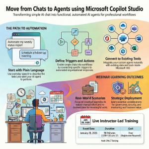 The Microsoft Copilot Studio webinar walks through what Copilot Studio is, how AI agents work, how to build and extend agents, and what to consider when putting them into use. The session also includes practical tips attendees can apply right away. The event is free and delivered in an instructor-led, online format.