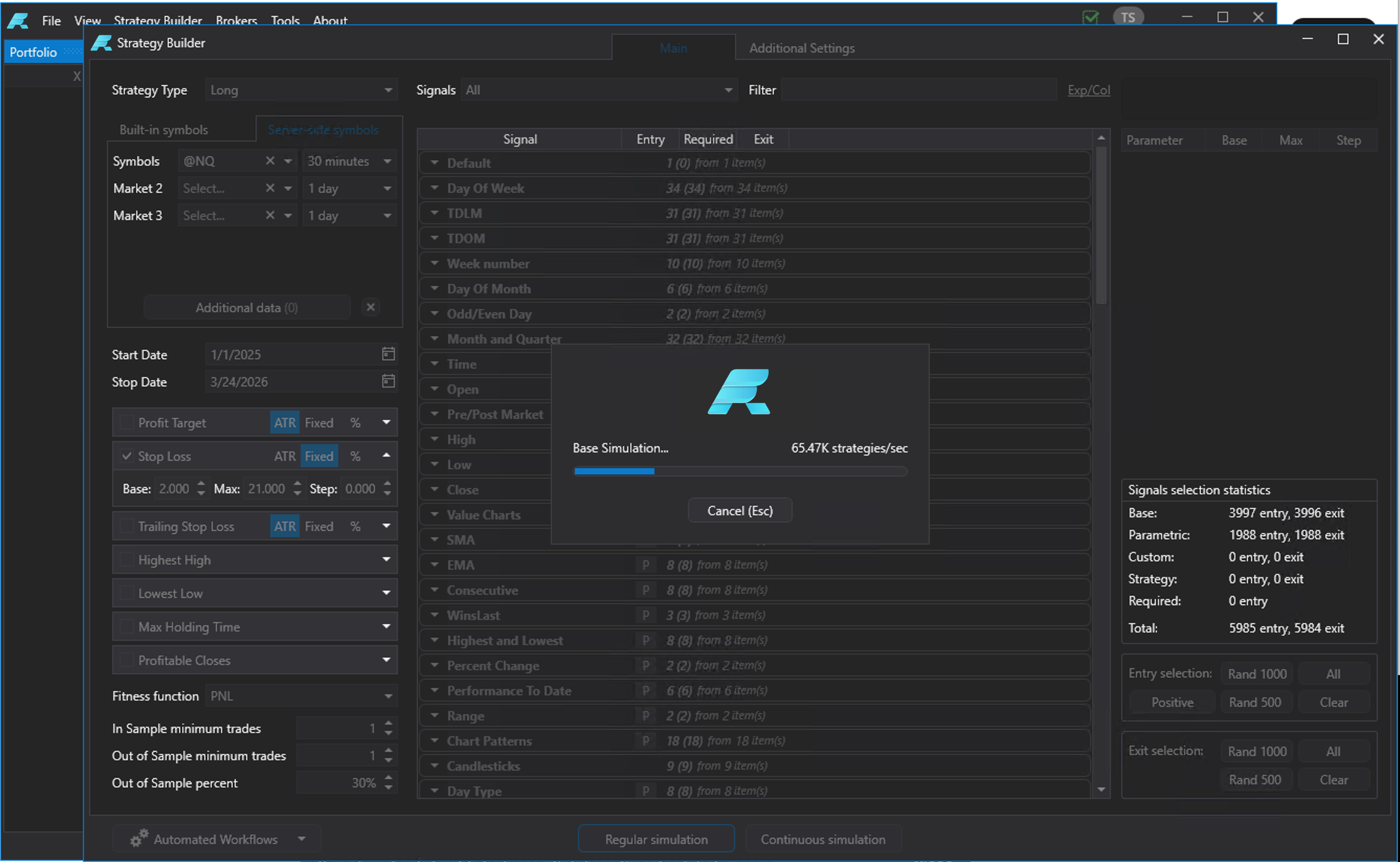 The engine automates the process of generating, testing, and filtering strategy candidates by combining technical indicators with varying risk parameters such as stop-loss distances, profit targets, trailing-stop configurations, and session-based filters. Each strategy is tested against historical market data with realistic execution modeling that accounts for commissions, slippage, and fill assumptions.