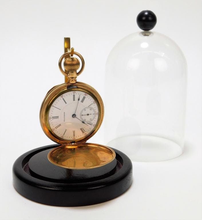 A circa 1907 gold pocket watch made by the Waltham (Mass.) Watch Company, in a 14kt gold case decorated with a shield and having a face featuring Roman numeral numbering and inner workings set to a hunting movement configuration, should fetch $400-$600. The watch, housed in a handsome glass display dome, is marked “P. S. Bartlett, Waltham, Mass.” on the face. It came from the collection of a Jamestown, Rhode Island woman.