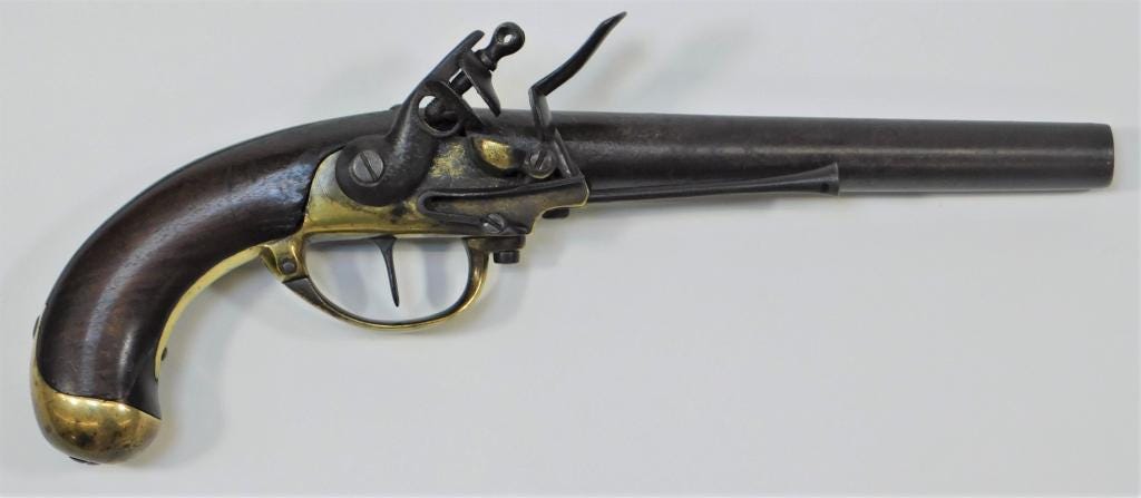 Circa 1799-1802 U.S. North & Cheney second contract pistol, model 1799, .74 bore, with serial number 697 marked on the shoulder of the breech plug, 14 ¼ inches long (est. $20,000-$30,000).