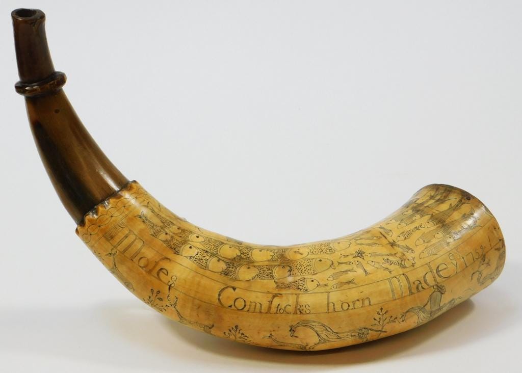 Powder horn from 1759, identified to Moses Comstock, whose name appears in the Massachusetts French & Indian War rolls, 19 ¼ inches in length (est. $7,000-$9,000).