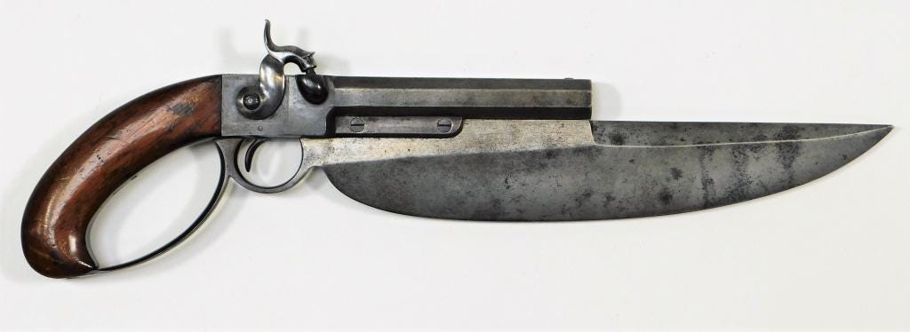 A circa 1837 U.S. Navy Elgin cutlass pistol, .54 bore with a walnut grip, should realize $15,000-$20,000. Only 150 cutlass pistols were made from a U.S. Navy contract, with the blades made by N. P. Ames. This example won the Gun Collector Committee’s Best of Show trophy at the NRA annual meeting in 2016, in an exhibition titled U.S. Military Pistols: Evolution to Perfection.