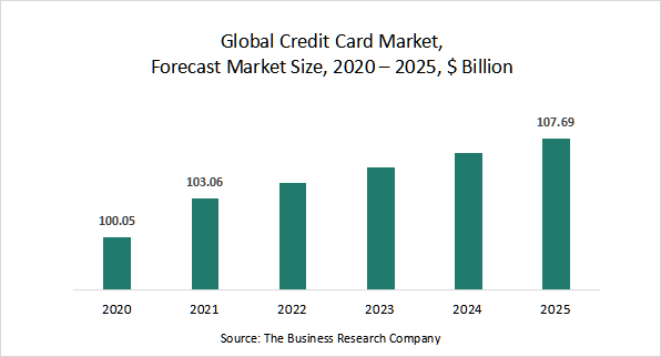 The global credit card market is expected to grow from $100.05 billion in 2020 to $103.06 billion in 2021 at a compound annual growth rate (CAGR) of 3%. The growth is mainly due to the companies rearranging their operations and recovering from the COVID-19 impact, which had earlier led to restrictive containment measures involving social distancing, remote working, and the closure of commercial activities that resulted in operational challenges. The market is expected to reach $107.69 billion in 2025 at a CAGR of 1.1%.