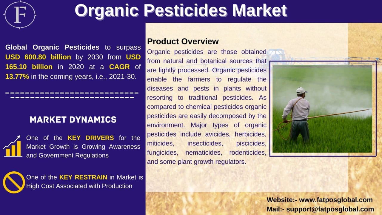 PHILADELPHIA, UNITED STATES , February 16, 2022 /EINPresswire.com/ -- Fatpos Global has released a report titled “Global Organic Pesticides Market1 - Analysis of Market Size, Share & Trends for 2019 – 2020 and Forecasts to 2030” which is anticipated to reach USD 600.80 billion by 2030. According to a study by Fatpos Global, the market is anticipated to portray a CAGR of 13.77% between 2021 and 2030. According to the report, the market is expected to witness significant growth due to its exceptional properties such as enhancing soil fertility and environmental sustainability in the long run. The growing support for organic farming by several government bodies and associations across the globe and increasing demand for organic food and products are projected to boost the growth of the organic pesticides market. In addition, the ongoing advancements in pest management procedures and technology is resulting in the greater utilization of pesticides which is contributing in the market growth.