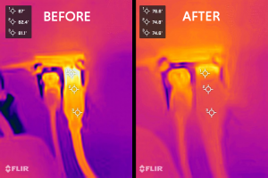 Testing at the College of DuPage in Illinois has shown removing parasitic load in an electric motor, power draw decreased by 25%. Simply by coating 6 electrical connections, electrical efficiency increased. The pictured thermal image shows temperature drop on just two coated plug connections. Enterprise Coatings, Inc. can instantly duplicate the effect in your facility. The material is food grade safe, nontoxic and the service is warranted. Testing in the audio field produced instant signal clarity by only coating the power cord connections. As additional audio connections were treated, audio quality continued to improve.