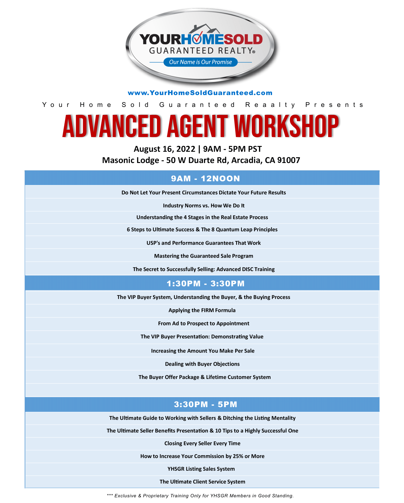 The Advanced Agent Workshop is Exclusive Only for YHSGR members. If you are interested to attend as a guest, please contact our Growth Advisor Sophie Tong at 626-789-0159