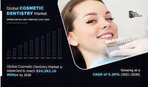 PORTLAND, OREGON, UNITED STATES, August 16, 2022 /EINPresswire.com/ -- According to a new report published by Allied Market Research, titled, “cosmetic dentistry, by product type, end-user, and age group: global opportunity analysis and industry forecast, 2021–2030," the global cosmetic dentistry market1 size was valued at $14.8 billion in 2020 and is projected to reach $24.3 billion by 2030 registering a CAGR of 5.20% from 2021 to 2030.