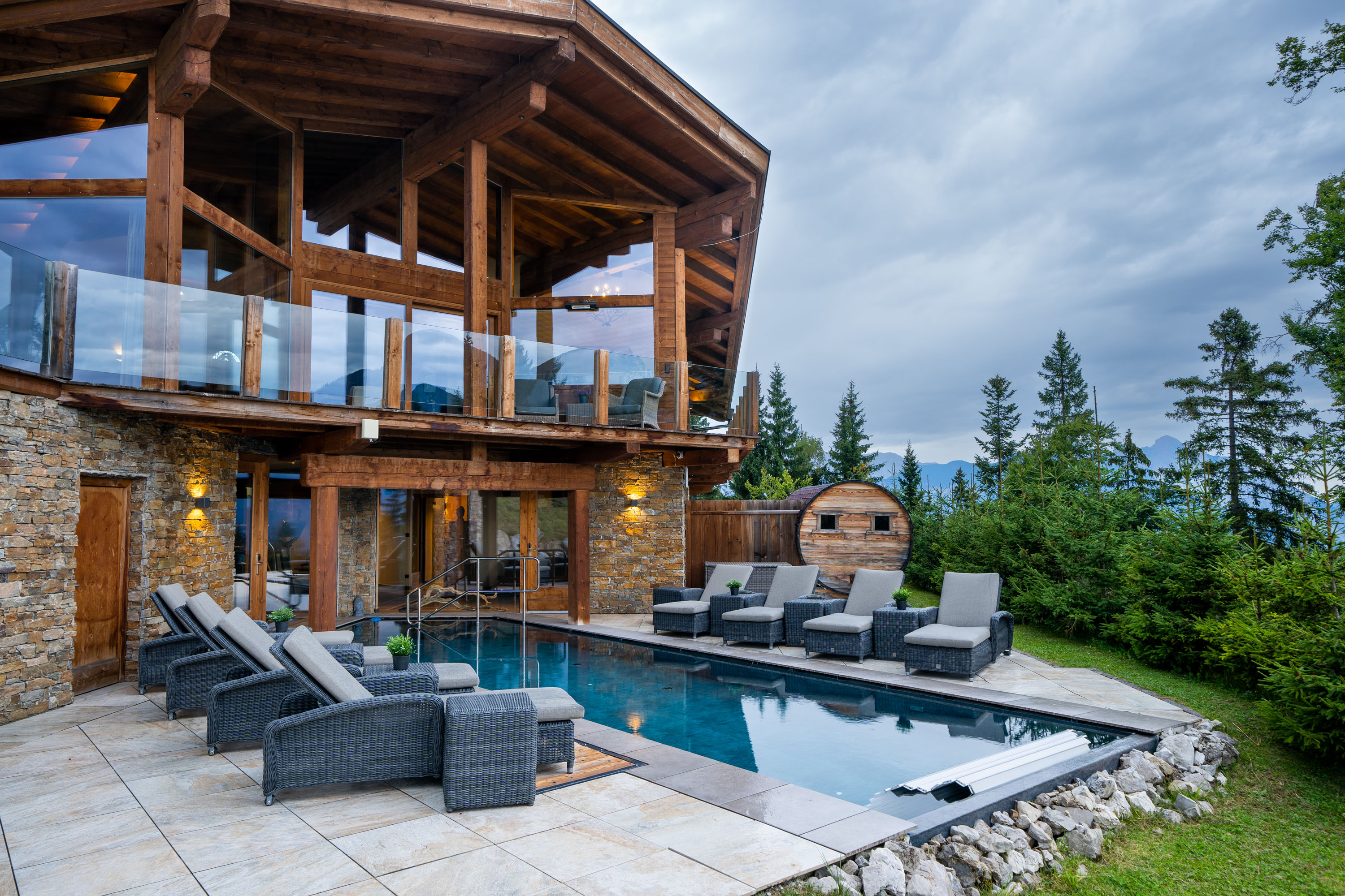 Every winter will transform into a wonderland from this estate in the heart of the Alps. Set against a backdrop of mountain ranges, experience 360-degree alpine views through the windows of this timber and stone estate. A host of luxury suites crowned by the penthouse with a 1:1-360 degree view of the Alps. Two additional guest apartments and five staff rooms ensure every visitor will be welcomed. Whether the season calls for a blanket of snow or rolling hills of green, the outdoor entertaining and recreation spaces are as inviting as the indoors. A front-row view of the Alps stretches beyond the infinity-edge pool. Enjoy the suite of wellness facilities, from the Finnish sauna to the steam bath. Architectural features include three private balconies, five private terraces, and a main four-floor elevator. The chef’s kitchen is equipped for a kitchen staff. Other amenities include a dry sauna, relaxation room, and a tasting room with a wine cellar, Property details provided by seller or others; buyer to verify.