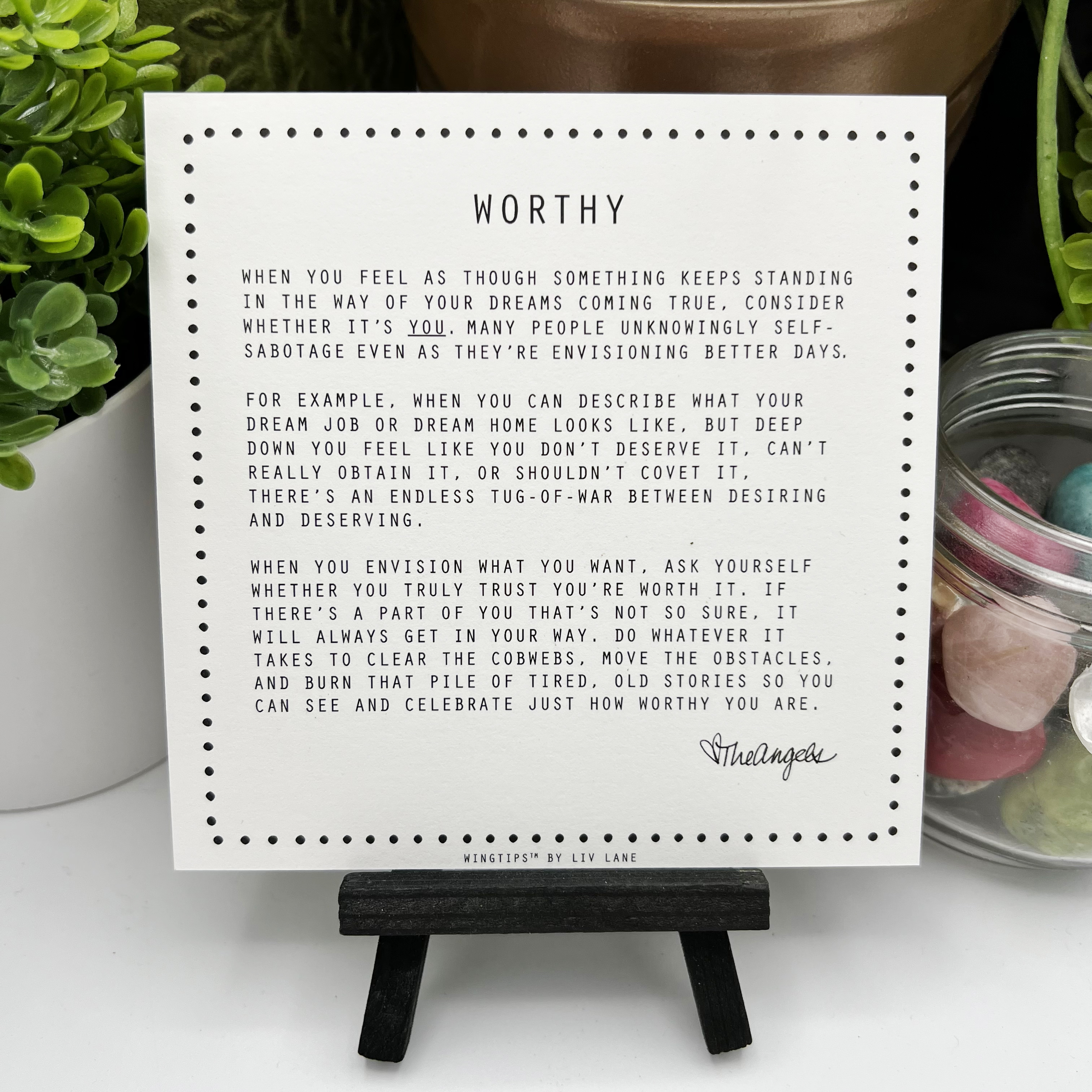 WingTips for Finding Magic and Meaning will spark a soul sister’s inquisitive, adventurous spirit, and encourage her to celebrate and explore her own intuition. This collection invites your friend to honor the magic in and around her each time she selects a print to display on the black, wooden easel included with this WingTips starter set.