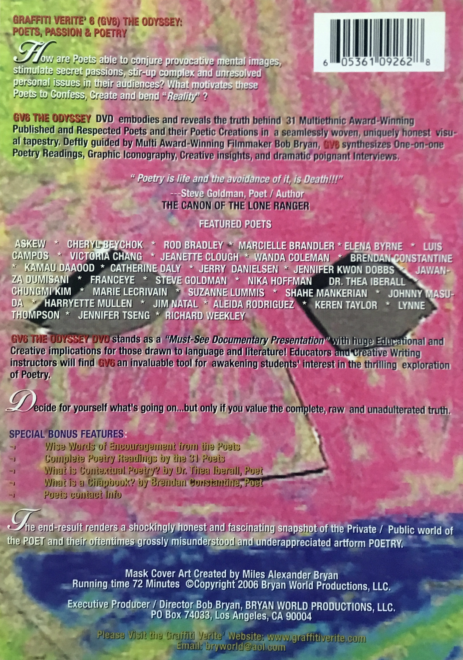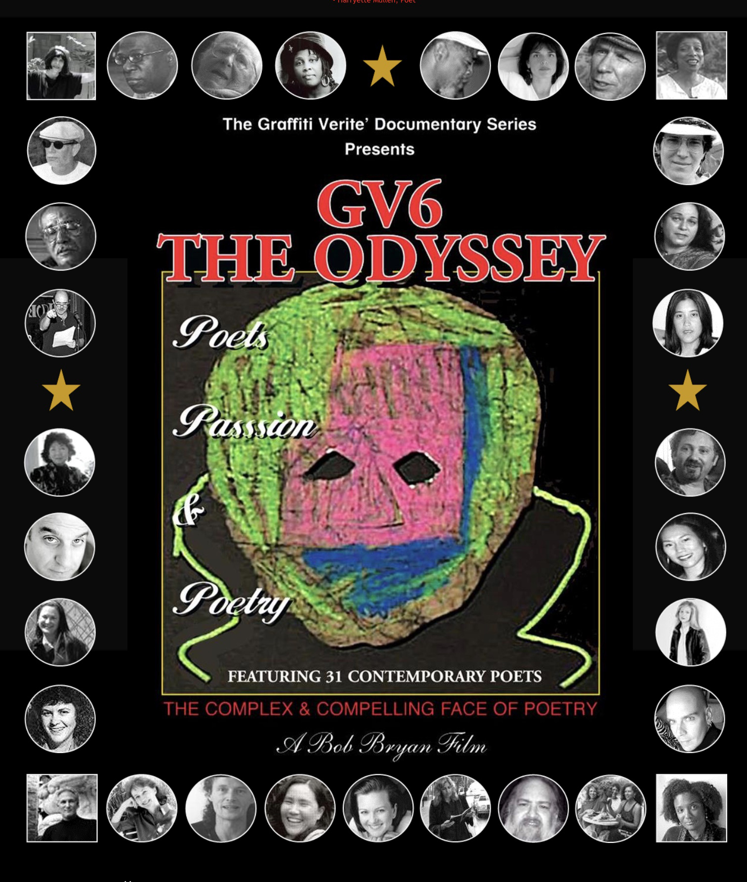 GV6 THE ODYSSEY examines and reveals the truth behind 31 Multi-Ethnic Award-Winning Published and Respected Poets and their Poetic Creations in a seamlessly woven, uniquely honest visual tapestry. Deftly guided by Multi-Award Winning Filmmaker Bob Bryan, GV6 synthesizes One-on-One Poetry Readings, Graphic Iconography, Creative insights, and dramatic poignant Interviews into a profound and enlightening presentation.
