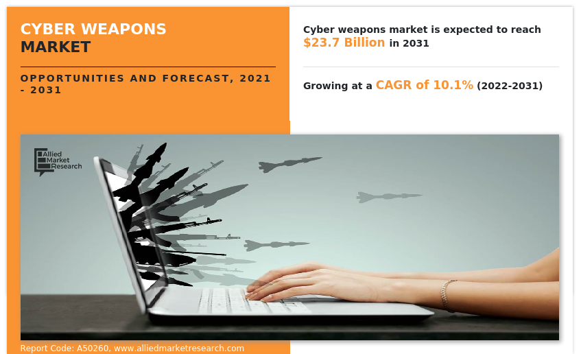 OREGAON, PORTLAND, UNITED STATES, April 17, 2023 /EINPresswire.com/ -- Allied Market Research published a report, titled, "Cyber Weapons Market by Type (Defensive, Offensive), by Application (National Defense System, Public Utility, Automated Transportation system, Smart Power Grid, Industrial Control System, Financial System, Communication Network, Others), by End User (Government, BFSI, Corporate, Other): Global Opportunity Analysis and Industry Forecast, 2021-2031." According to the report, the global cyber weapons market was valued at $9.2 billion in 2021 and is estimated to generate $23.7 billion by 2031, witnessing a CAGR of 10.1% from 2022 to 2031.