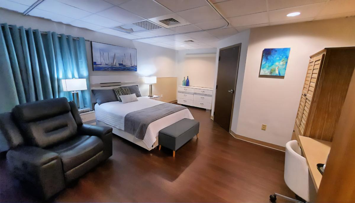 The refreshed sleep lab, which features a private bathroom and shower, was outfitted with a new wardrobe, cabinet, storage bench, power recliner, office desk chair, and assorted bedding. The designers chose whites, neutrals, and accents in various shades of blue to offset the high-quality furnishings, creating a peaceful retreat for patients.