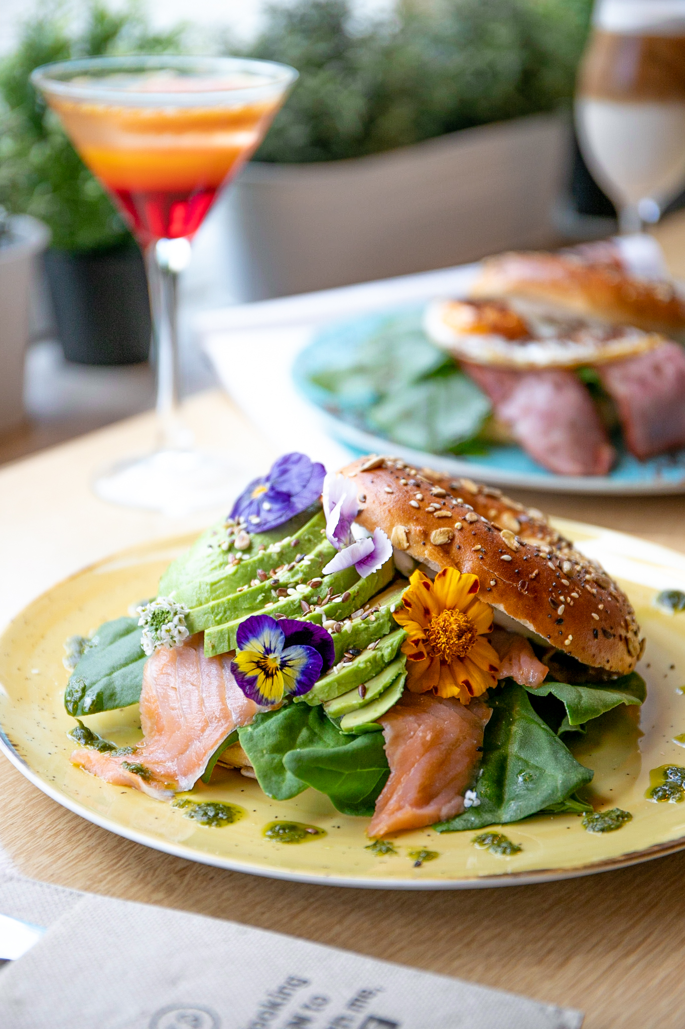 O Persea (14€) é ideal para os fãs de abacate. Junta salmão fumado, queijo creme e o nosso azeite caseiro de manjericão. “Além das cores chamativas que o prato tem por si só, decoramos com flores e um mix de sementes.”