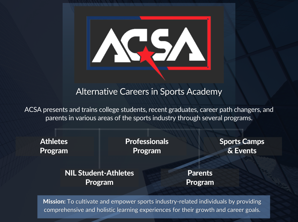 ATLANTA, GEORGIA, UNITED STATES, June 21, 2023/EINPresswire.com/ -- Alternative Careers in Sports Academy1 (ACSA2) is pleased to announce its grand opening and launch to serve the sports industry community. ACSA presents and trains athletes, college students, recent graduates, career path changers, and parents in various developmental areas of the sports industry through comprehensive and holistic learning experiences and programs.