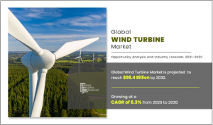 According to a new report published by Allied Market Research, The wind turbine market1 size was valued at $53.4 billion in 2020, and is projected to reach $98.4 billion by 2030, growing at a CAGR of 6.3% from 2021 to 2030.