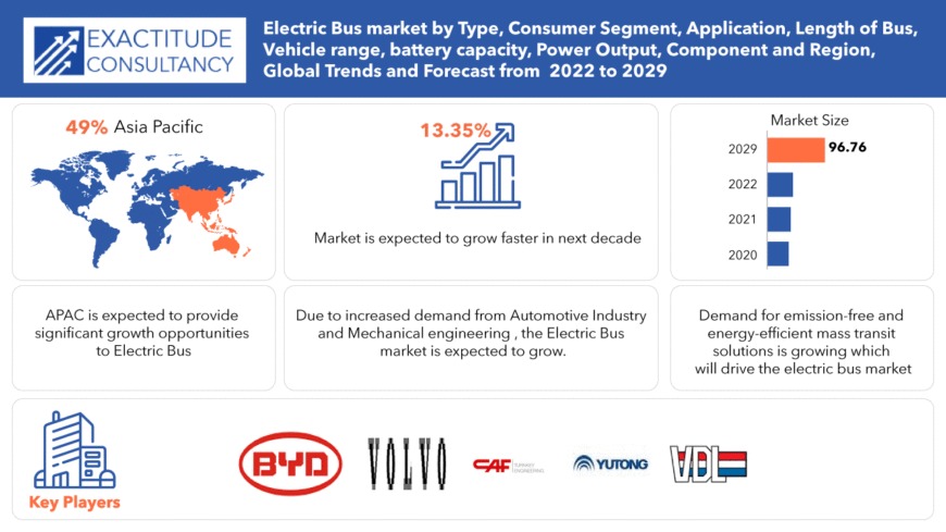 According to a Comprehensive Research Report by Exactitude Consultancy, “Electric Bus Market1 by Type (BEV, PHEV, FCEV), Vehicle range, battery capacity, Power Output (Up to 250 kW, Above 250 kW), Component – Global Forecast from 2022 to 2029”, The global Electric Bus Market size is USD 31.91 Billion in 2020 and is expected to grow till USD 96.76 Billion by 2029, at a compounded annual growth rate (CAGR) of 13.35%.