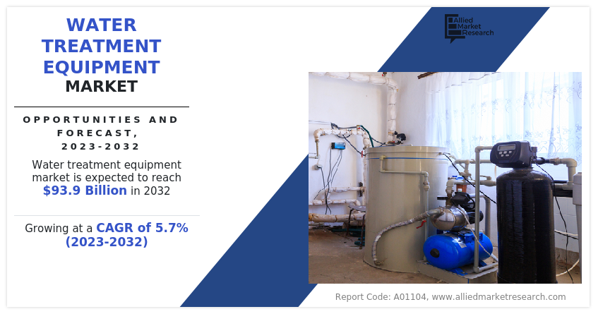 WILMINGTON, DELAWARE, UNITED STATES, December 5, 2023 /EINPresswire.com/ -- According to the research report by Allied Market Research, Global Water treatment equipment market1 size was valued at $54.3 billion in 2022 and is anticipated to exceed $93.9 billion by 2032, exhibiting a CAGR of 5.7% from 2023 to 2032. The global water treatment equipment market is expected to grow significantly in the coming years due to the increase in demand for clean and safe drinking water, the growth in population, and increase in industrialization. However, changes in the regulatory environment and low consumer awareness inhibit the development owing to the price-sensitive nature of this market. The usage is limited in developing countries as the price of water treatment equipment is relatively higher compared to its traditional counterparts. Moreover, emerging economies are expected to lead the water treatment equipment market in the coming years. In addition, a rise in awareness regarding energy conservation and sustainability in the construction industry is expected to benefit the water treatment equipment industry.