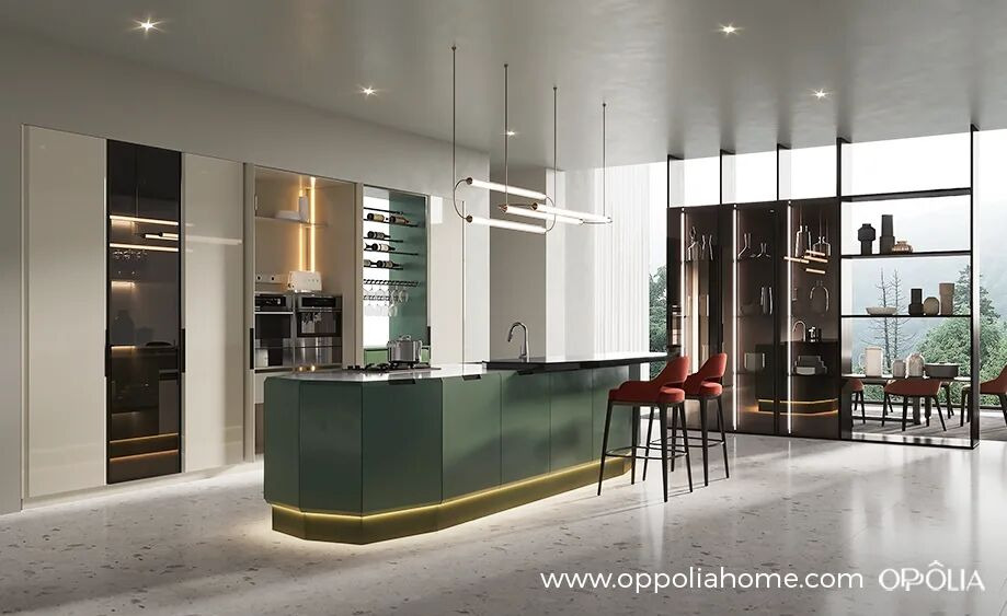 ●Kitchen: The green kitchen island, resembling a polished emerald, serves as a focal point with a bar countertop and wine rack, offering a modern design with bold colors.
