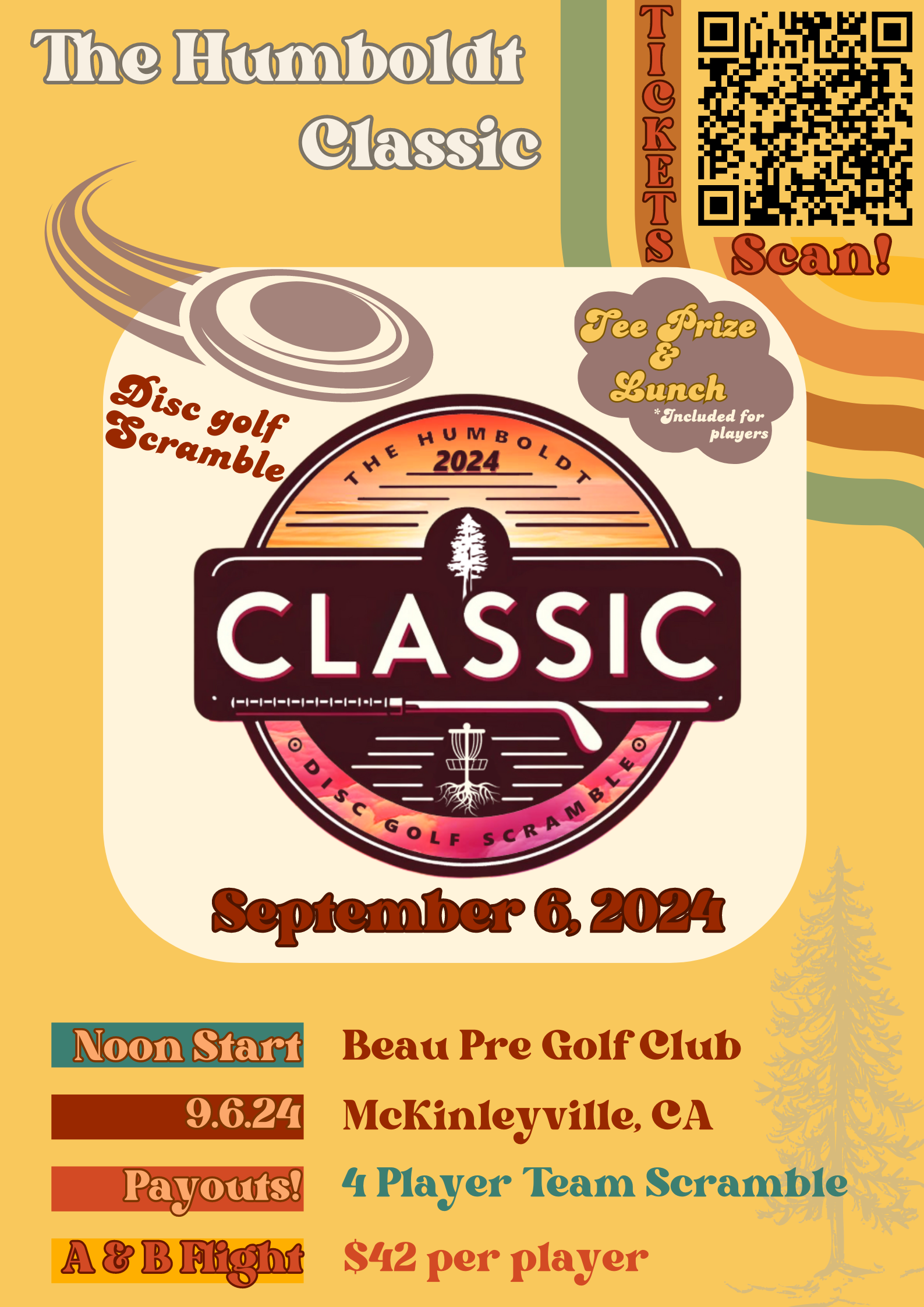 The Humboldt Classic Disc Golf Scramble will begin at noon on September 6th, 2024. Tickets are $42 and are available for purchase here.3