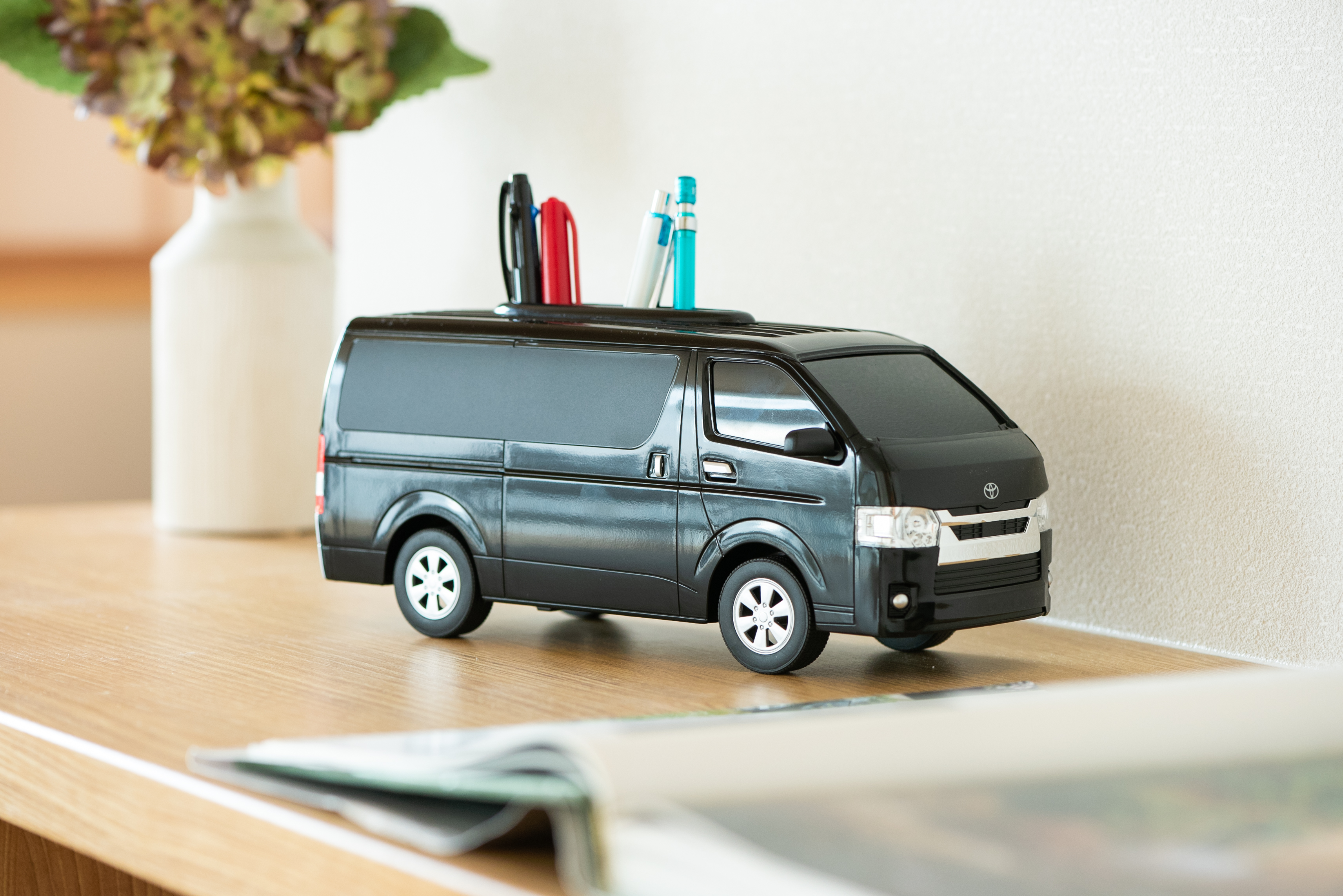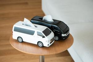 This tissue case features intricate details like rolling wheels and faithfully recreated front and headlights, making it look like a miniature car model. The renewed version offers a color scheme that closely resembles the real HiAce, available in two colors: white and black.