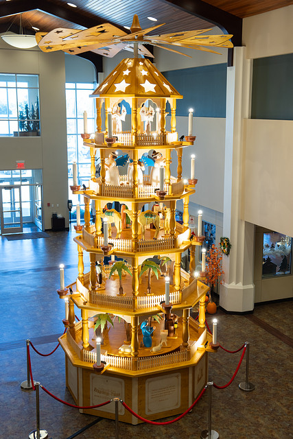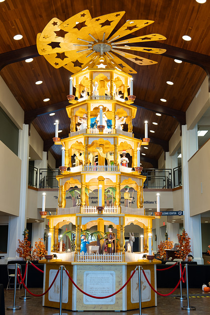 Christmas pyramids are a treasured tradition in German culture, and this pyramid is certain to become a Christmas favorite at White’s Chapel and throughout the community. Standing as the largest indoor Christmas pyramid in the United States, this five-level masterpiece tells the story of Christmas with exquisite detail and beauty.