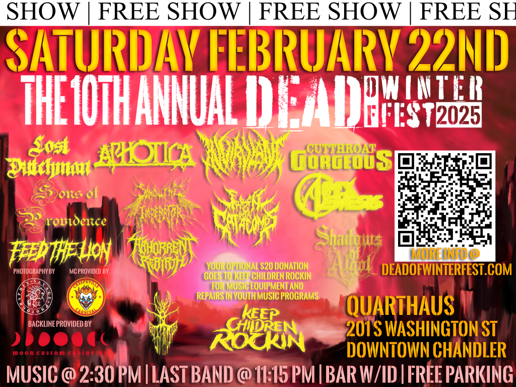 PHOENIX, AZ, UNITED STATES, February 6, 2025 /EINPresswire.com/ -- Keep Children Rockin'3 proudly presents the 10th Annual Dead of Winter Fest2 (DOWF), a celebration of heavy metal and community giving. This free all-day festival takes place at The QuartHaus in Chandler, Arizona, uniting bands, fans, and philanthropists to raise funds for youth music programs across the Phoenix area.