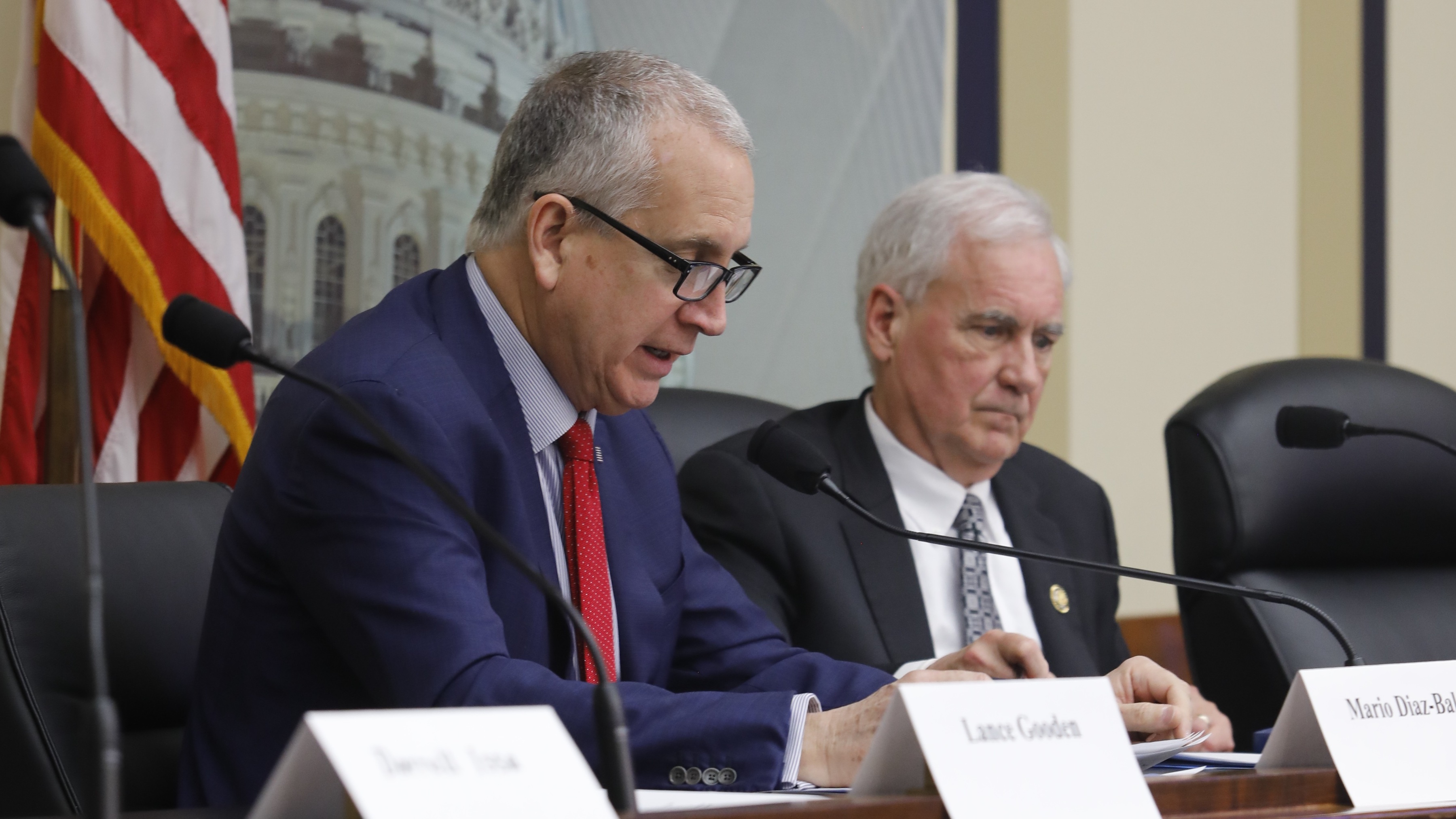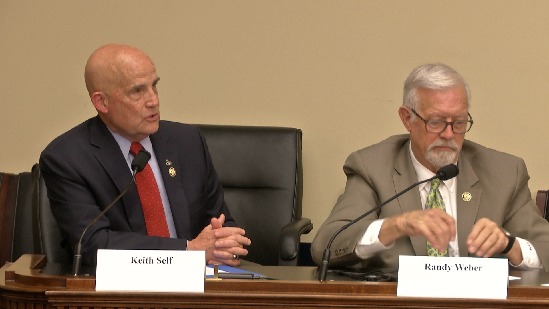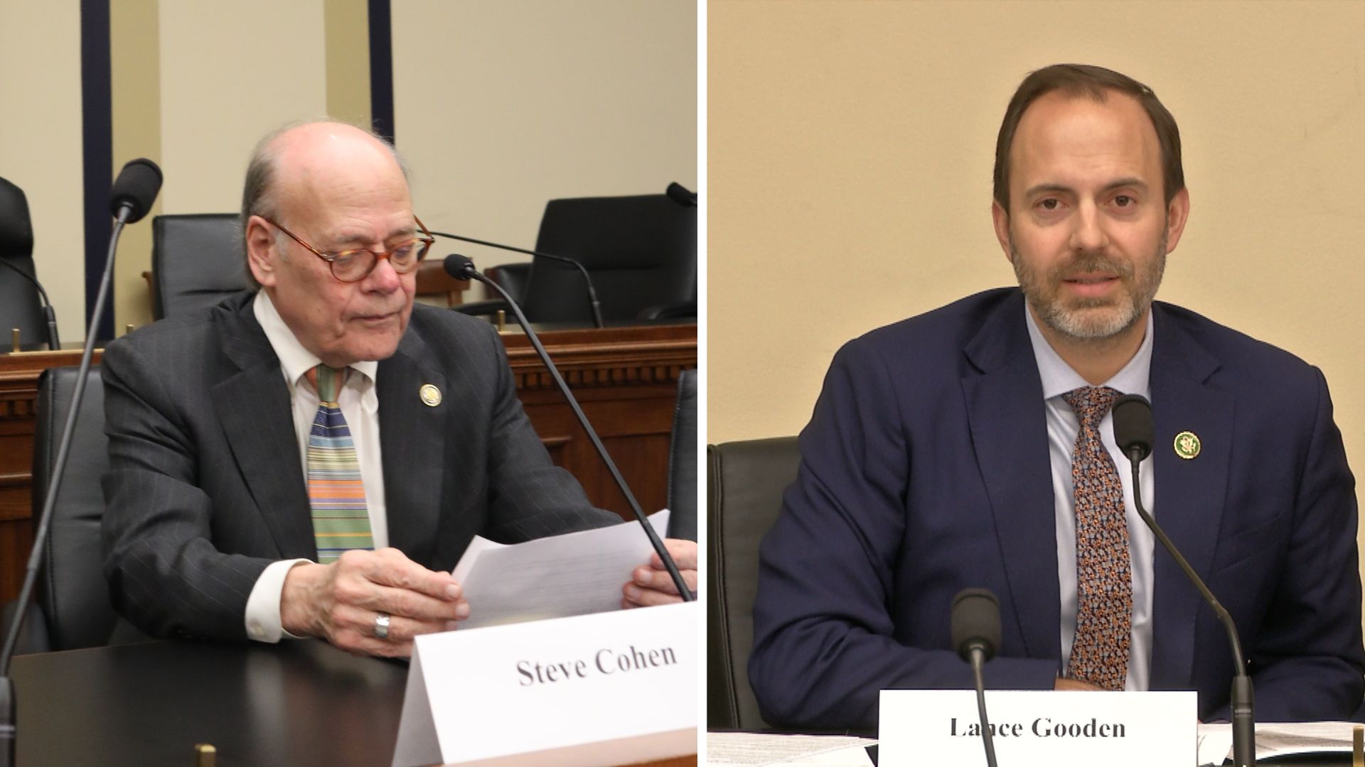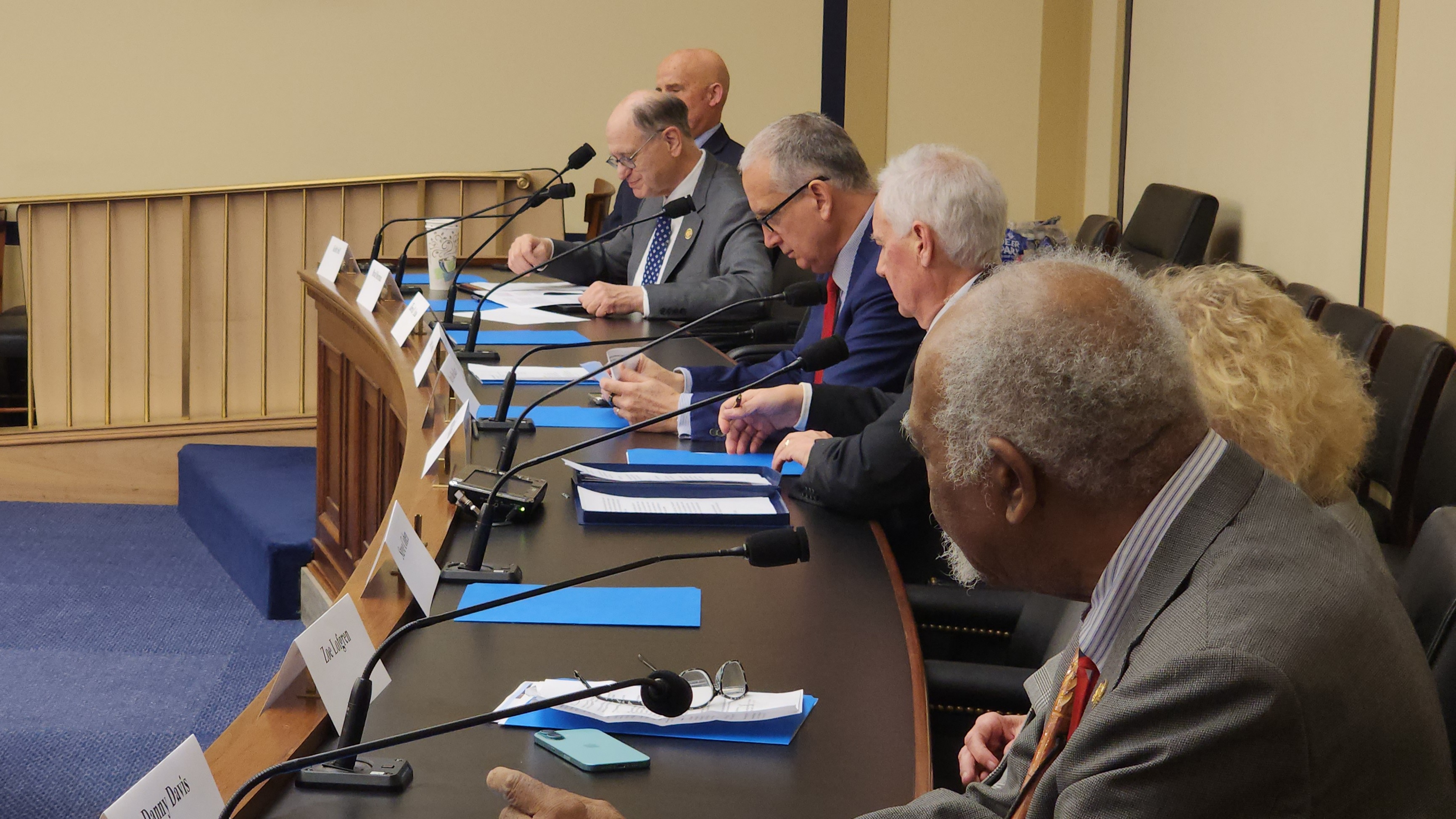 Representatives (from left) Keith Self, Brad Sherman (speaking), Mario Diaz-Balart, Tom McClintock, Zoe Lofgran and Danny Davis during the 26 Feb 2025 House Hearing by Iran Human Rights and Democracy Caucus where Maryam Rajavi testified on the future of Iran.