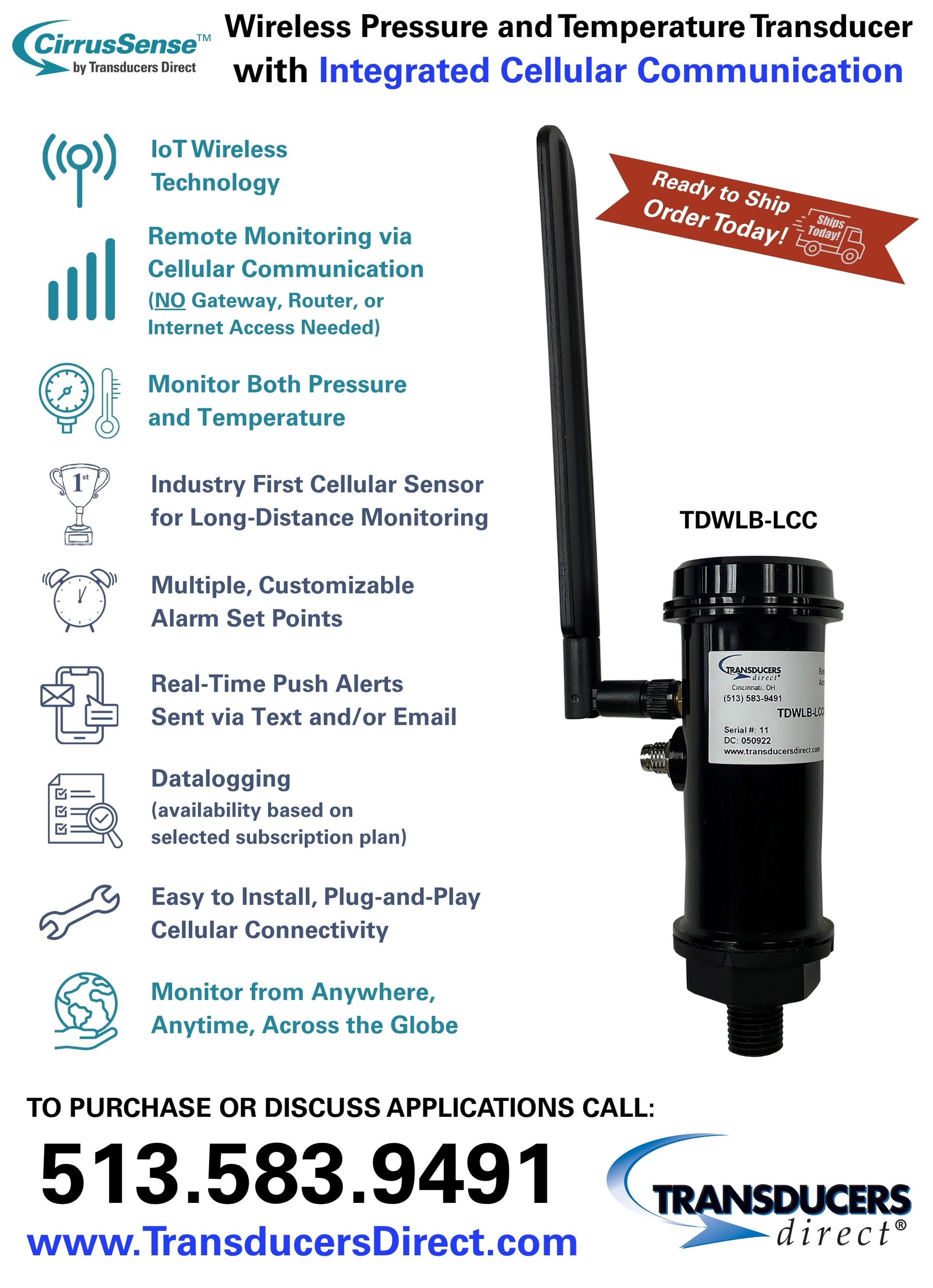 The world's first IoT pressure and temperature transducer, the CirrusSense™ wireless pressure and temperature transducer with integrated cellular communication makes monitoring temperature and pressure easier than ever. You can also contact our technical support team, talk through your application to assure compatibility and functionality and is it is available to order now through our website at www.TransdcuersDirect.com.