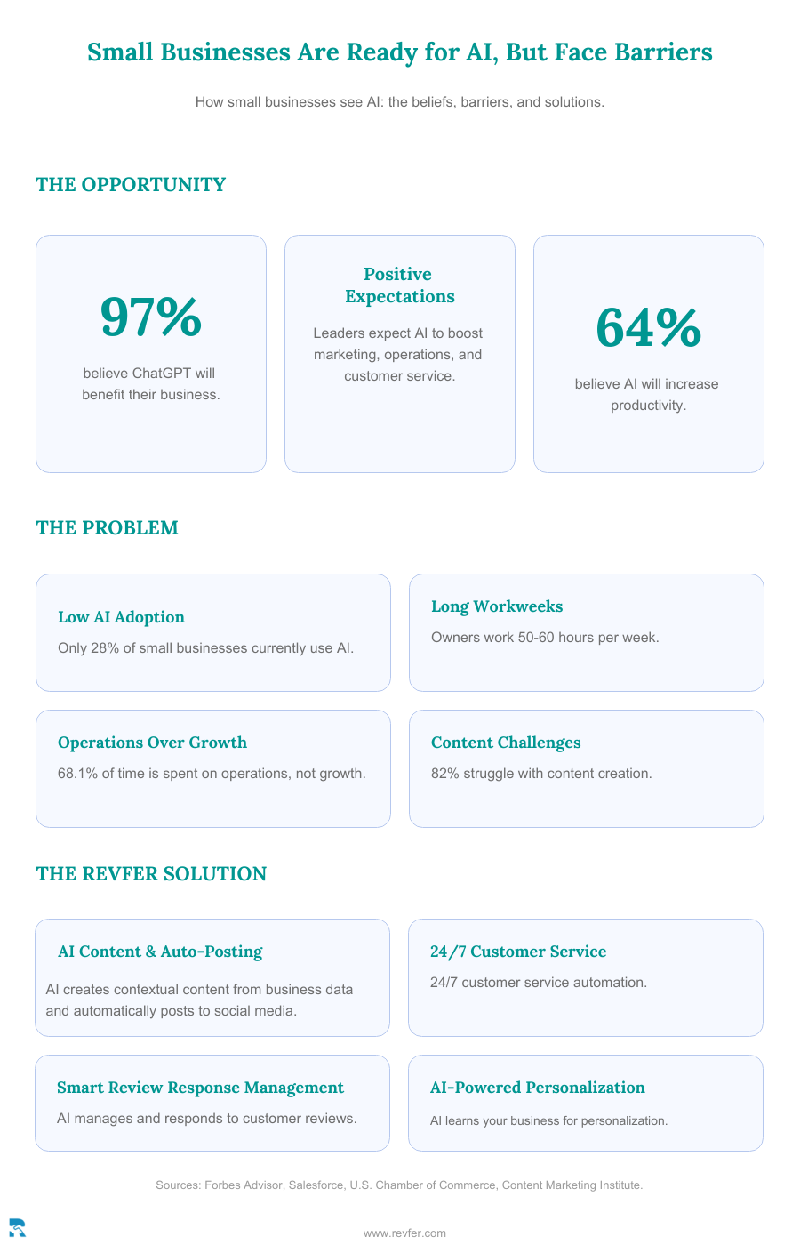 These statistics reveal a fundamental challenge: small business owners are trapped in operational cycles that leave little time for the strategic thinking, business development, and innovation that drive growth. They recognize that tools like AI could help—Forbes research confirms 97% see the value—but implementation has seemed financially and technically out of reach.