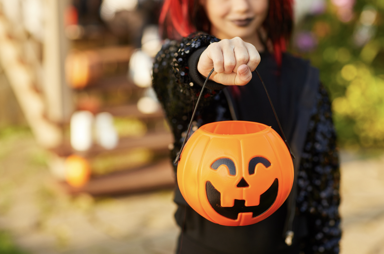 Teen holding pumpkin trick or treat bag